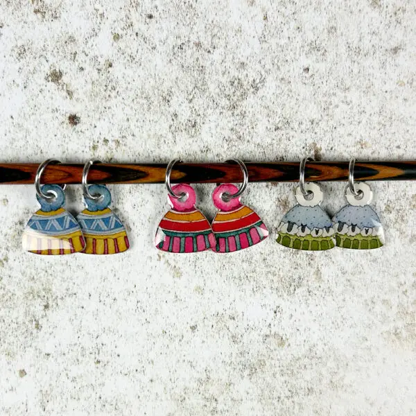 Each set of these whimsical stitch markers includes a total of six markers, featuring two each of three unique hat designs created by Emma Ball, – we especially love the Baa-ble hat with the sheep, don’t you?